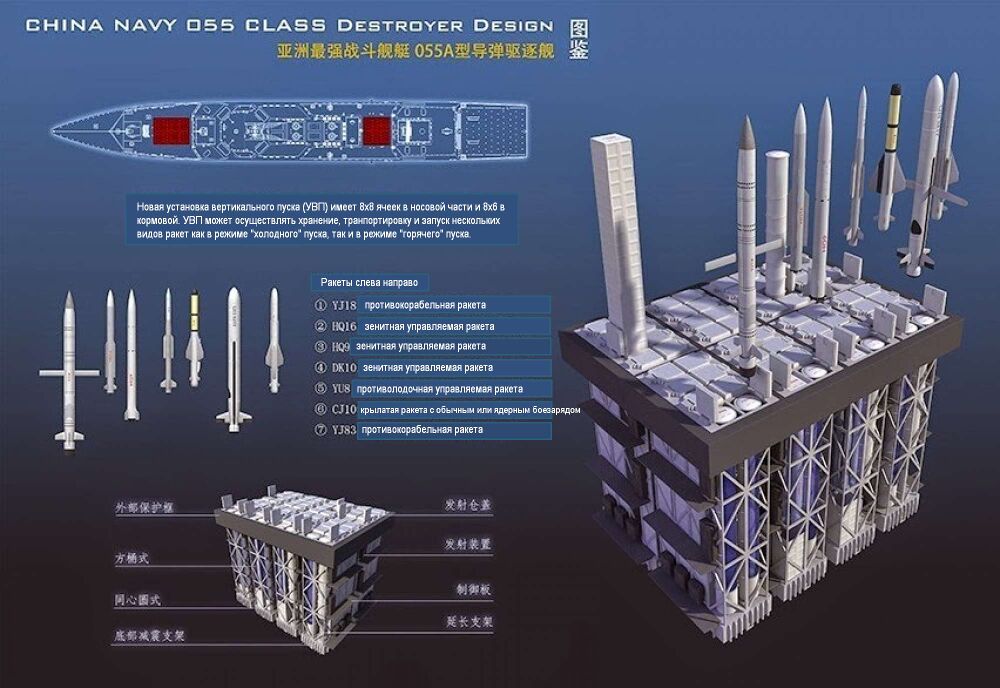 Основным вооружением эсминцев проекта 055 являются две универсальных УВП. Носовая УВП имеет 8х8 модулей (64 ячейки) и располагается перед настройкой. Вторая УВП (8х6) имеет 48 ячеек и расположена перед ангаром. УВП может осуществлять пуск управляемых ракет следующих типов: