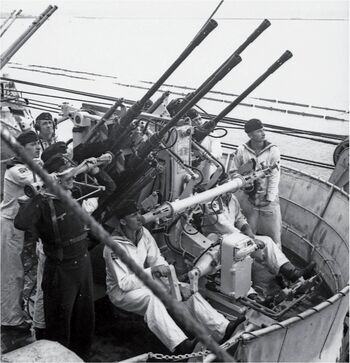 ↑Одним из первых кораблей вооруженных установками Vierling C38/43 был линкор Scharnhorst получивший в 1941 году две установки на платформах по бокам авиационного ангара. Во время ремонта повреждений в апреле-июне 1944 года десять установок получил линкор Tirpitz. О монтаже установок Vierling C38/43 на другие крупные корабли достоверных сведений не сохранилось. Установками Vierling C38/43 вооружались быстроходные десантные баржи типа Marinefährprahm (MFP), паромы-катамараны типа Siebelfähre (Siebel) и другие.