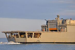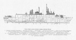 Две дымовые трубы установлены рядом и образуют V-образную фигуру. Непосредственно перед ними размещена мачта-однодеревка. Позади труб на приподнятой надстройке установлен решетчатый пилон с размещенными на нем РЛС обнаружения воздушных и наземных целей и управления огнем. Короткая полетная вертолетная палуба находится на корме, ниже нее — открытый ют.
