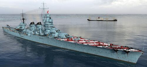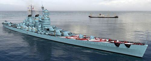 Заряды хранились в защитных металлических контейнерах, снимавшихся перед подачей на подъемник. Погрузка боеприпасов осуществлялась через четыре широких лацпорта, прорезанных в бортах на уровне главной палубы. В их открытые дверцы выставлялись рельсовые пути, выступавшие на 3 м за борт, по которым ходили электрические вагонетки грузоподъемностью 650 кг, подававшие снаряды и заряды к четырем элеваторам, опускавшим их в погреба. Внутри погребов имелись люльки грузоподъемностью 250 кг.
