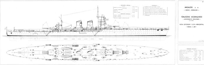 Достоверно известно о разработке эскиза лишь трехорудийной башни с 203-мм/55 орудиями «Ansaldo» Model 1934. Для примера можно рассмотреть вариант №3 проекта тяжелого крейсера фирмы «Ansaldo» 1940 года