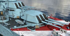 Орудия были разработаны фирмой «Ansaldo» (модель «Ansaldo 1934») и также с некоторыми изменениями производились фирмой «O.T.O.» (модель «O.T.O. 1936»). Но что было гораздо важнее, фирмой «Ansaldo» были сконструированы двух- и трехорудийные башни, избавленные от порочной практики установки всех орудий в одной люльке, что приводило к большому рассеиванию снарядов при стрельбе залпами.