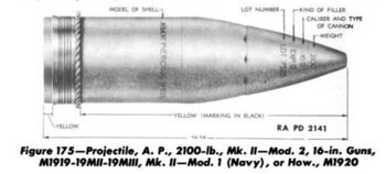 - бронебойный снаряд Army AP Mark 2 - флотский Navy AP Mark 3 с другим взрывателем, весом 952,5 кг, длиной 1435 мм (3,5 калибра) и 26,3 кг взрывчатки Explosive D.