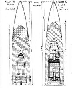 - Palla da 406/50 (APC)[7] - бронебойный с донным взрывателем, весивший 1075 кг и содержанием взрывчатого вещества - 12,35 кг Cast TNT (фугасность - 1,15%);
