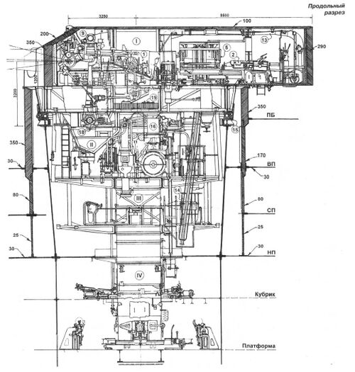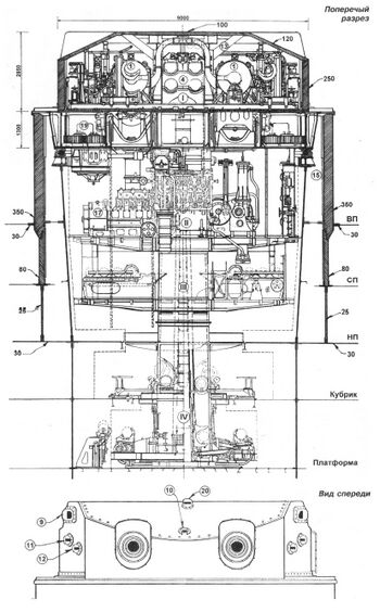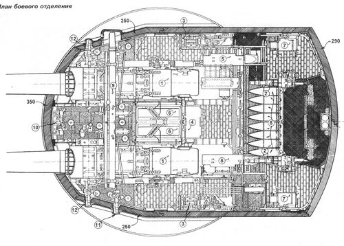 | Обозначения к схеме слева: 1 - орудие со станком, 2 - прибойник, 3 - привод подачи снарядов, 4 - зарядный стол, 5 - снарядный подъёмник, 6 - шахта подачи зарядов, 7 - люк для выброса гильз, 8 - снаряды в кранцах, 9 - башенный дальномер, 10 - башенный визир, 11 - визир орудия, 12 - прицел орудия. | |
