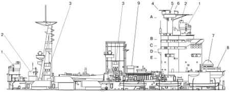 Уровни надстройки: A - Платформа управления зенитным огнем (зенитная платформа); B - платформа постов управления огнем; C - адмиральский мостик; D - компасная платформа (капитанский мостик); E - платформа прожекторов.