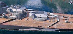 Очевидно, что 457-мм/52 двухорудийные башенные установки не отличались бы по конструкции от установок Drh LC/34[14] с двумя 380-мм/52 орудие SK C/34 линейных кораблей типа Bismarck[15] и примерно соответствовали общепринятой в других странах схемы. Барбеты башен опирались на броневую палубу, ниже которой были расположены снарядные и зарядные погреба (немцы, в отличие, от американцев или японцев на кораблях типа Yamato, никогда не хранили снаряды в барбетах). Высота барбета возвышенных башен выбиралась с учетом максимального угла снижения и возможности вести стрельбу в оконечности через нижнюю башню при углах возвышения, близких к нулю.
