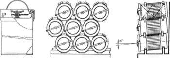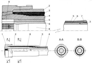 1 - кольцо казенника; 2 - кожух; 3 - проволочная навивка; 4, 5 - скрепляющие цилиндры; 6 - внутренняя труба; 7 - наружная труба; 8 - зарядная камора; 9 - казенник.