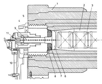 1 - казенное кольцо; 2 - зарядная камора;3 - заряд 55 кг (шесть для выстрела полным зарядом); 4 - затворный поршень; 5 - резьбовые сектора; 6 - кольцо обтюратора; 7 - газовая прокладка; 8 - кольца уплотнения; 9 - запальная втулка; 10 - кронштейн затвора; 11 - электрозапал.