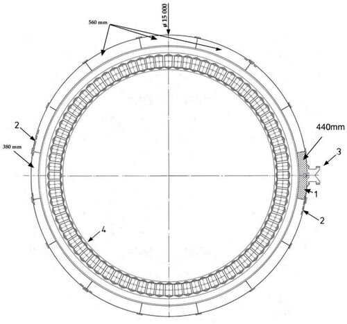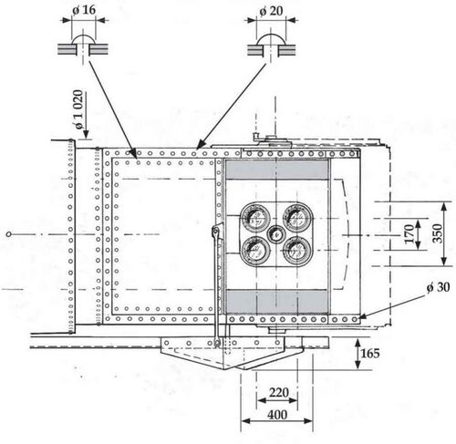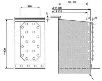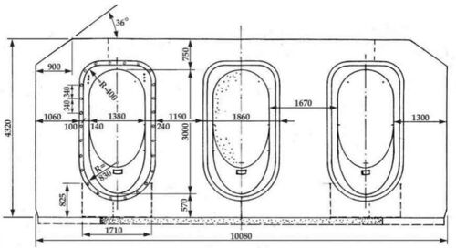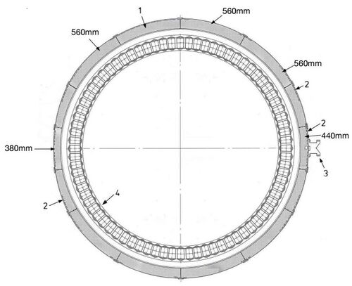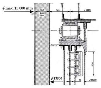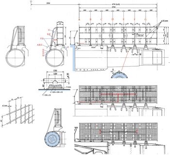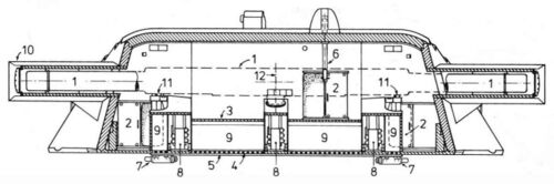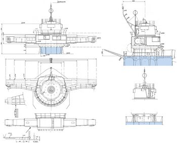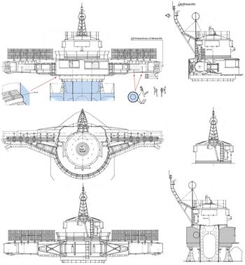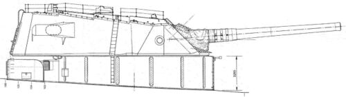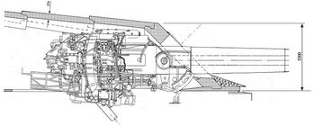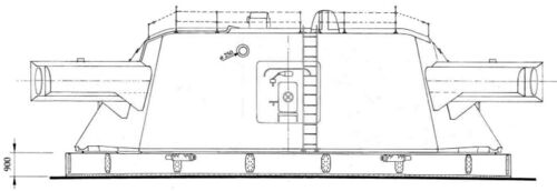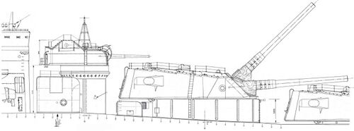 | Внутренний диаметр роликового погона, м Наружный диаметр роликового погона, м Расстояние между центром вращения и цапфами, м Расстояние от оси орудия до роликового погона, м Расстояние между осями орудий, м Откат орудия, м |