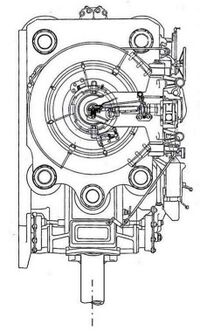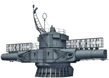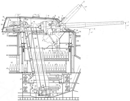 Таким образом, цикл стрельбы составлял 28 с при малом возвышении, около 34 с - при +20° и около 40 с при максимальном угле возвышении в 45° - отличные показатели для орудий такого калибра. Горизонтальная и вертикальная наводка осуществлялась посредством гидропривода. Система горизонтальной наводки была дублирована и включала два гидравлических привода мощностью по 500 л .с. и передачу типа «рейка-шестерня», примененную вместо традиционной для японских установок червячной передачи, для которой просто не хватало места. Одновременно использовался только один привод, второй был резервным. Для вентиляции служила независимая система, включавшая два нагнетательных вентилятора мощностью по 15 л.с. и пять вытяжных по 5 л.с.
