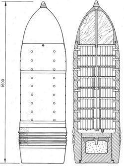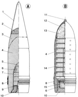 1 - баллистический обтекатель; 2,3 - две части бронебойного наконечника; 4 - корпус снаряда; 5 - алюминиевый «противоинерционный» блок (служит для предотвращения преждевременной детонации ВВ); 6 - заряд ВВ; 7 - оболочка заряда ВВ; 8 - ведущие пояски; 9 - взрыватель Type 13 mod.5; 10 - стакан; 11 - головка взрывателя Type 91; 12 - дистанционная трубка-замедлитель; 13 - деревянная головная часть (обтекатель); 14 - осколочные и зажигательные элементы; 15 - детонатор.