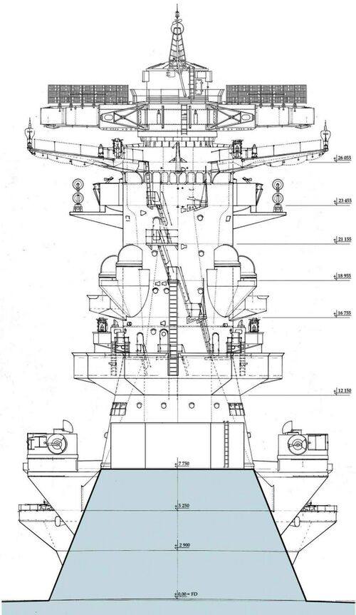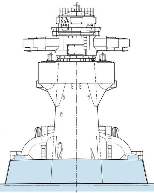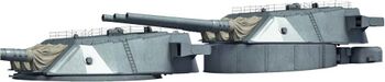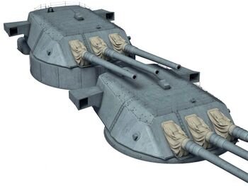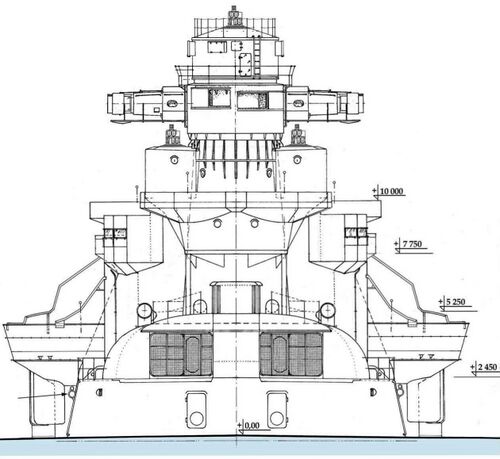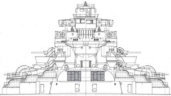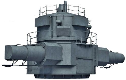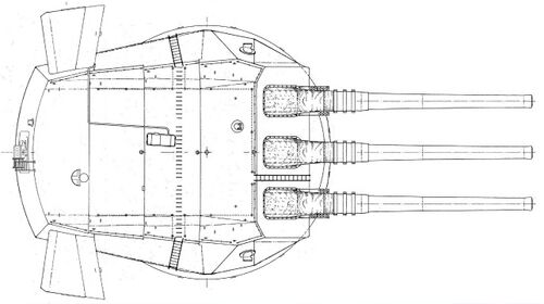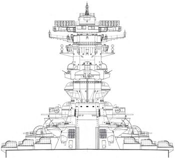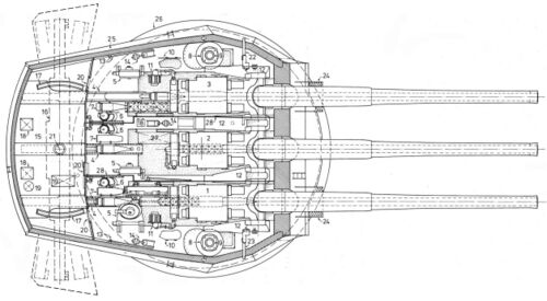Столь же внушительными, как сами орудия, выглядели орудийные башни главного калибра. Каждая из них весила 2510 т (2774 т с боезапасом) - больше, чем эсминец времен Второй мировой войны. Значительная доля этого веса (свыше трети) приходилась на сверхмощное бронирование. Каждая башня разделялась стальными переборками на четыре отделения: по одному на каждое из орудий и отделение с оборудованием. Отдельный отсек позади самой орудийной установки предназначался для гигантского 15-метрового дальномера.
