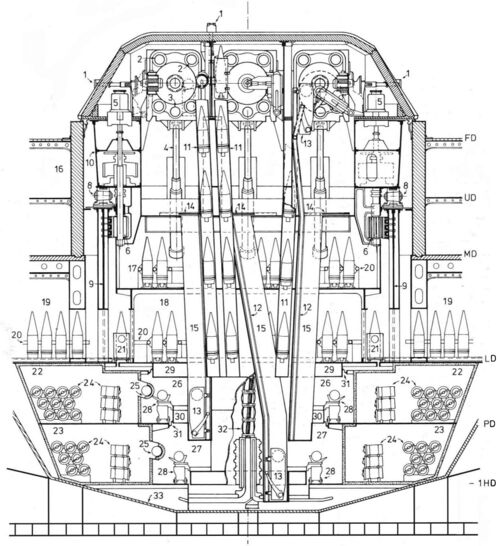 Хранилище готового к бою запаса внутри цилиндрической части основания башни имело два уровня, с любого из них можно было осуществлять погрузку в каждый из трех элеваторов - по одному на орудие. Из нижней части вращающейся структуры они выталкивались прямо к подъемнику, сначала на нижнюю горизонтальную платформу, наклоненную под углом 5° к горизонту, а затем в сам подъемник. Дверцы подъемника автоматически закрывались с помощью подпружиненного кривошипного механизма, когда «ковш» подъемника воспринимал вес снаряда. Последний располагался в подъемнике под небольшим углом к вертикали, и дополнительно удерживался тремя захватами. Когда снаряд достигал верха подъемника, специальный механизм заваливал его под прямым углом к первоначальному положению, укладывая почти горизонтально. Затем снаряд перегружался в наклонный лоток, расположенный под углом 8° к горизонту (напомним, что угол заряжания составлял 3°), а в лотке снова крепился, теперь специальными скобами. После этого подготовленный к заряжанию снаряд перегружался из подвижного лотка на неподвижный, а затем в загрузочную каретку.