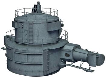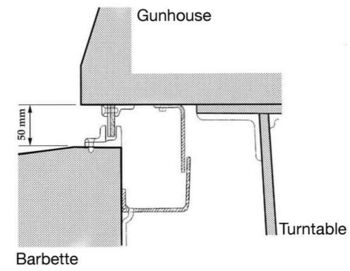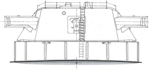 Оборудование башни включало 15-метровый дальномер с углом возвышения 10°. При этом угол поворота по горизонту у дальномера с такой большой базой был очень маленьким - по прицельному полю 130 милов влево и 160 милов вправо (1 мил = 0,001 дюйма). Каждое орудие имело свой 10-см перископ.
