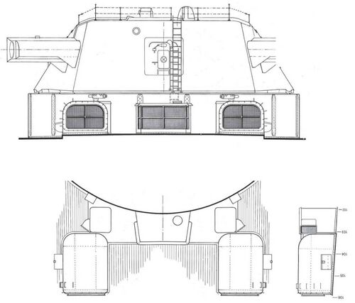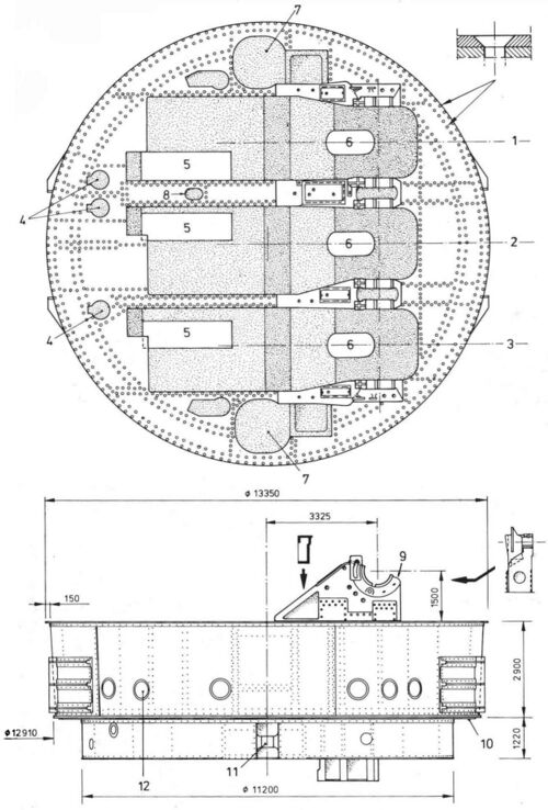 | Вес трех орудий с затворами, т Вес остальной качающейся части установки, т Поворотная платформа и броня, т Вес остальных вращающихся при горизонтальной наводке частей (вращающаяся структура), т Броня стенок и крыши башни, т Вес боезапаса внутри вращающейся структуры, т |