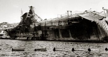 • взрыв заряда взрывчатки, доставленного человеко-торпедой с итальянским экипажем, намеченный на 7:00 19 апреля 1945 года и оставшийся незамеченным в порту, не причинил сколько-нибудь серьезных повреждений корпусу авианосца. Здесь может быть несколько причин: неисправность взрывателя с часовым механизмом, неполная детонация заряда, заряд ушел глубоко в ил, заряд был размещен «далеко» от корпуса авианосца и т.д. В любом случае, повреждением от него считается пару оторванных листов обшивки буля...