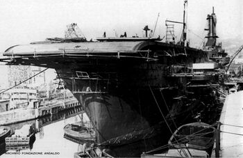 Начавшиеся военные действия на Средиземном море сразу показали слабое взаимодействие итальянских корабельных группировок в море с авиацией берегового базирования. Причем, если с подобной ситуацией относительно ударной авиации можно было еще как-то мириться и надеяться на ее улучшение в будущем, то вопрос истребительного прикрытия кораблей в море стал неотлагательным. Последней «каплей» стал налет на Таранто 11 ноября 1940 года, когда два десятка устаревших палубных торпедоносцев Swordfish с английского авианосца HMS Illustrious тяжело повредили три итальянских линкора. Причем, если Caio Duilio и Littorio потребовался полугодовой ремонт, то Conte di Cavour больше в встрой так и не вошел. В феврале 1941 года флот выходит с предложением переоборудовать Roma, но уже не в авиатранспорт, а в полноценный авианосец. 21 июня 1941 года принимается окончательное решение, и судно идет на судоверфь «Ansaldo» в Генуе.