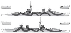К 1942 г. в итальянском флоте была разработана стандартная камуфляжная окраска, в которой учитывались типичные условия освещенности на Средиземном море. Основным цветом оставался светлый пепельно-серый, на который наносились широкие контрастные полосы темно-серого. Оконечности часто красились в грязно-белый цвет, чтобы маскировать размер поднимаемых кораблем волн и, таким образом, затруднять определение скорости. Рисунок на правом и левом бортах зачастую был неодинаковым.