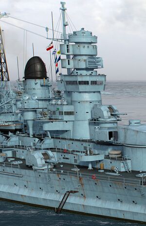 В тыльной части каждой башни главного калибра размещалась дуплексная система, состоявшая из двух 14-метровых дальномеров - одного совмещающего типа и одного стереоскопического. Еще одной дуплексной системой из двух 9-метровых дальномеров оснащался главный дальномерный пост в верхней части башенноподобной надстройки, в то время как находившийся под ним второй дальномерный пост оборудовался одним 9-м стереоскопическим дальномером, использовавшимся адмиралом и его штабом для определения тактической обстановки и также способным служить для измерения дистанции по второй цели при разделении огня. Еще один, резервыный, дальномерный пост с одним 9-м стереоскопическим дальномером находился на кормовой надстройке. На грот-мачте размещены РЛС обнаружения и РЛС управления артиллерийским огнем главного калибра.