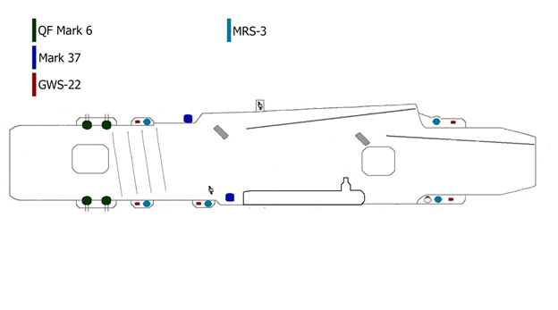 Артиллерийское вооружение авианосца HMS Eagle включало 16 орудий 114-мм/45 QF Mark III в спаренных установках BD Mark II**[2], а также зенитные орудия 40-мм/56 Bofors - восемь в шестиствольных установках Mark VI, два в спаренных установках Mark V и девять в одиночных установках Mark VII. Для управления зенитных огнём служил командно-дальномерный пост CRBF с 12-ю радарами.