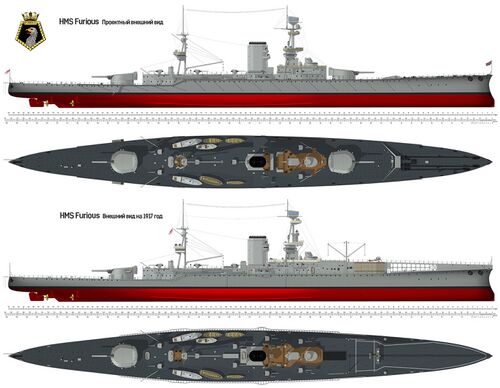 | HMS Furious | «Armstrong», Эльсвик | 08.06.1915 | 18.08.1916 | 04.07.1917 | Сдан на слом 15.03.1948 г. |