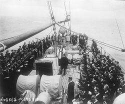 Экипаж подводной лодки HMS Е-18. Фотография 1915 года. На бескозырках многих матросов надпись «HMS Maidstone»