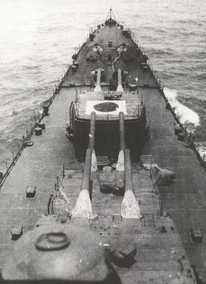 - ангар для самолётов, надстройка вокруг грот-мачты и прожекторная площадка были переоборудованы для снижения веса. Вспомогательные установки управления огнем и радиорубка перенесены в носовую надстройку, а настил зенитных установок продлён до башни № 4, образовав авиационный ангар. Эти изменения позволили снизить вес надстроек более чем на 115 тонн;