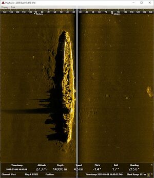 Корабль затонул примерно в 38 морских милях к юго-западу от мыса Бинит, остров Панаон (9.66° с. ш. 124.83° в. д.). 9 сентября 2019 года было размещено сообщение об обнаружении останков крейсера. Корпус лежит на дне, глубина в районе затопления около 1450 метров, на ровном киле и, кроме носовой части, очень хорошо сохранился.