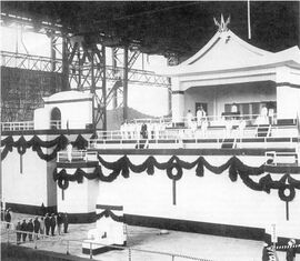 Церемония спуска на воду IJN Yamato. Слева на заднем плане — занавес из сизалевых циновок, скрывающий эллинг верфи Куре.