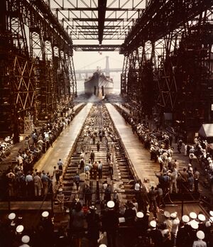 Подготовка к спуску на воду USS Iowa. Верфь Нью-Йорка, август 1942 г.