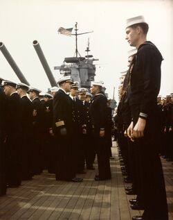 Линейный корабль USS Iowa за свою долгую боевую жизнь получил множество корабельных наград в том числе и иностранные. Линкор USS Iowa награжден 11 боевыми звездами: 9 за участие во Второй Мировой войне и 2 - за действия в Корее. Ниже приводится список в порядке расположения их населенными на мостике линкора.