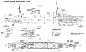 Уникальной особенностью корабля было наличие на нём адмиральских апартаментов, которые были расположены в корме. Предполагалось, что Jaguar будет выполнять роль флагмана флотилии эсминцев. Помимо адмирала, на корабле были предусмотрены дополнительные каюты для 4 штабных офицеров. Рядовые члены экипажа размещались в носовом кубрике, под которым находился винный погреб и склад с провизией. Дальше к носу располагался продовольственный холодильник, а под носовой надстройкой мичманский кубрик. Камбуз был вынесен в надстройку под первую дымовую трубу. Офицерские каюты находились в носовой надстройке, а кают-компания располагалась под кормовой надстройкой.