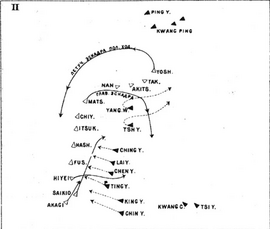 Впереди шёл «летучий отряд» адмирала Цубои Кодзо в составе быстроходных крейсеров IJN Yoshino (флагман), IJN Naniwa, IJN Takachiho и IJN Akitsushima. За ним шли основные силы - флагманский крейсер IJN Matsushima, IJN Itsukushima, IJN Hashidate, IJN Chiyoda, бронированные корабли IJN Fuso и IJN Hiei. На левом траверзе колонны главных сил, в хвосте, Ито приказал поставить вспомогательный крейсер IJN Saikyō Maru, на котором держал флаг начальник штаба японского флота контр-адмирал Кабаяма Сукэнори, и канонерскую лодку IJN Akagi.