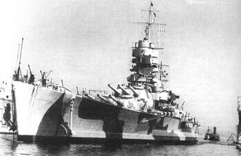 Во время налета британских бомбардировщиков линкор был поражен двумя зажигательными авиабомбами (длина 50 см, диаметр 126 мм, толщина стенок 4 мм). Одна попала в прожекторную площадку на кормовой надстройке с правого борта, пробив ее, и взорвалась с сильным выбросом зажигательной смеси на надстроечную палубу. Сами прожекторы при этом никаких повреждений не получили. Вторая бомба попала в пост управления зенитной стрельбой левого борта, пробила его крышу и застряла в этой пробоине. Медленное горение зажигательного состава было потушено песком.