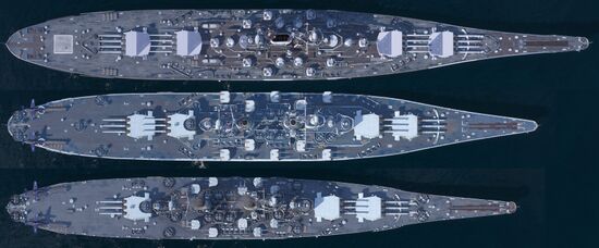 - ↑ На третьей палубе имелся сквозной коридор, оснащенный монорельсом и прозванный американскими моряками «Бродвеем». Он соединял погреба всех трех башен и позволял передавать снаряды от носовых орудий кормовым и наоборот.