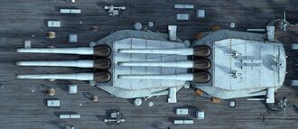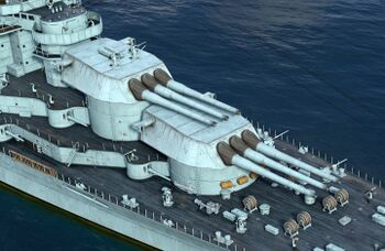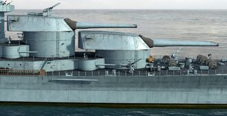 Башенные установки, оснащенные гидравлическим приводом вертикальной и электрическим горизонтального, имели горизонтальные углы наведения - ±150° от диаметральной плоскости, вертикальные - -5°...+45°. Скорость горизонтального наведения - 1,7°, вертикального - 10° в секунду. Угол заряжания - +5°. Боезапас составлял 120 снарядов на орудие - всего 1440 выстрелов на линкоре.