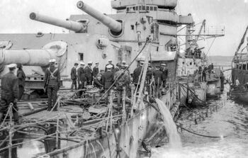 - ↑ Впрочем, при этом на полном ходу их не заливало как линейные крейсера, имевшие значительно большую мощность двигательных установок и скорость хода по сравнению с линкорами. Когда эти быстроходные тяжелые корабли выходили из базы в боевой поход с полным запасом топлива на борту, на полной скорости их верхняя палуба в корме уходила под воду. Сохранилось немало фотографий немецких линейных крейсеров в подобном состоянии, на которых их кормовые башни, шлюпбалки, леерные стойки и флагшток выглядят довольно курьезно, окруженные со всех сторон клокочущими потоками воды.