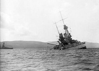 SMS Bayern и SMS Baden, стоявшие на якорях ближе всех к флагманскому кораблю Рейтера, оперативно приступили к выполнению последнего в их короткой боевой судьбе приказа. SMS Bayern, находившийся на более глубоком месте, чем его собрат, принимал воду через кормовые торпедные трубы, а также многочисленные кингстоны и заборные патрубки машинно-котельных отделений, и быстро садился кормой. Его главный шлюпочный кран левого борта, сорвавшись со стопоров, развернулся перпендикулярно борту и раскачивался из стороны в сторону. Когда орудия четвертой башни уже погрузились, форштевень линкора поднялся высоко вверх и из клюза левого борта вывалился якорь и повис низко над водой. SMS Bayern уходил на дно кормой, все глубже оседая в воду и кренясь на левый борт. На гафеле линкора продолжал развиваться императорский военно-морской флаг, а на ноке фока-рея - сигнал адмирала фон Рейтера, призывающий к последней, самоубийственной жертве. Вскоре нос еще выше поднялся из воды, и корабль, потеряв остатки продольной остойчивости, грузно повалился на левый борт. В 14.30 огромный линкор, перевернувшись вверх днищем, пошел на дно Скапа-Флоу одним из последних немецких дредноутов - лишь SMS Derfflinger, SMS Hindenburg и SMS Markgraf из последних сил боролись с потоками воды, чтобы вскоре разделить судьбу остальных немецких кораблей.