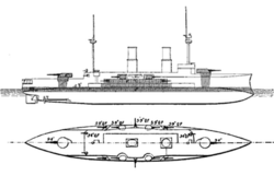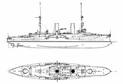 Новый проект по габаритам был чуть меньше прототипа, нес поясную броню в два раза более тонкую, вооружался вдвое меньшим числом орудий главного калибра, зато имел увеличенную на 1500 л.с. суммарную мощность машин. Все это сделали ради одного: чтобы крейсер "бежал" немного быстрее броненосцев.