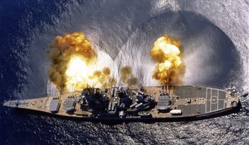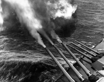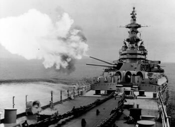 Линкор USS Missouri ведет стрельбу из носовых 406-мм орудий, 1944-45 гг. Справ видны выпущенные снаряды.