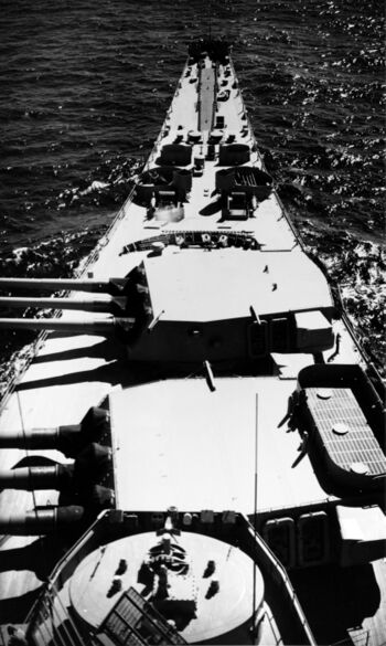 Линкор USS Iowa, 1943 г. Носовые башни развернуты на корму, отсутствуют антенны электронного оборудования.