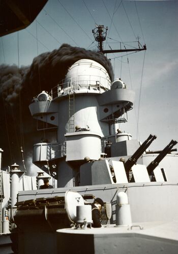 Носовая надстройка линкора USS Iowa. Сан-Франциско, июль 1947 г. КДП главного калибра Mark-38 с РЛС Mark-13.