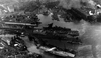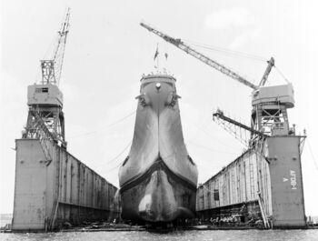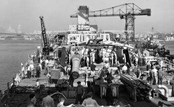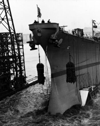 Корпус линкора USS Iowa после спуска на воду. Верфь Нью-Йорка, 27 августа 1942 г.