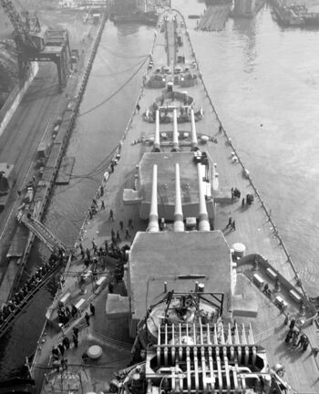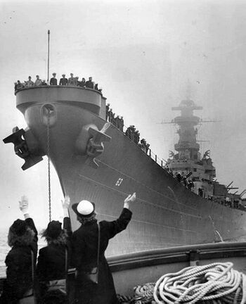 Линкор USS Wisconsin, лето 1945 г.Линкор USS Wisconsin через некоторое время после спуска на воду. Филадельфия, конец 1943 г.Поврежденный нос USS Wisconsin после столкновения с эсминцем USS Eaton 6 мая 1956 г.Линкор USS Wisconsin в норвежском Осло, 2 июля 1947 г..Поврежденный нос USS Wisconsin после столкновения с эсминцем USS Eaton 6 мая 1956 г.Линкор USS Wisconsin на реке Гудзон. Нью-Йорк, август 1951 г.