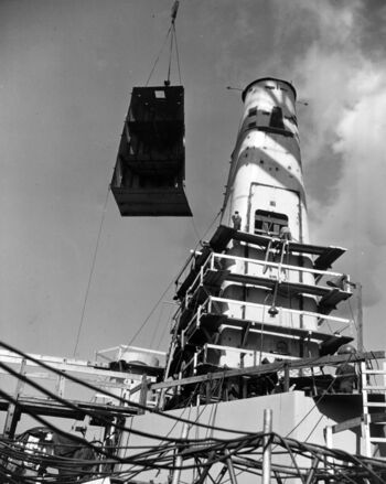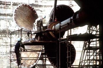 Демонтаж броневого прикрытия 127-мм установки линкора USS Wisconsin, стволы уже демонтированы. 1 ноября 1983 г.