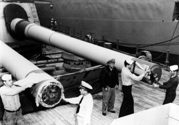 Стрельба из носовых 406-мм башен линкора 'USS New Jersey, 14 марта 1969 г.Постановочное фото - стрельба на оба борта из 406-мм и 127-мм орудий линкора 'USS New Jersey. Север Тихого океана, 11 октября 1986 г.Перегрузка пороховых зарядов в транспортной укупорке на USS New Jersey со снабженца USS Haleakala, 4 октября 1968 г.Носовая часть линкора USS New Jersey. Церемония ввода в строй, Филадельфия, 23 мая 1943 г.Проба артиллерии линкора USS New Jersey, 20 ноября 1943 г.Фото диорамы с линкорами USS Iowa и USS Alabama, наглядно показывающая размеры «договорных» и пост-«договорных» линкоров.Броневая рубка и дверь в нее линкора USS Iowa.Линкор USS Iowa в плавдоке USS ABSD-2. Папуа Новая Гвинея, 28 декабря 1944 г.Тыльная часть кормовой 406-мм башни линкора USS Iowa и установленный на ней 40-мм счетверенный «Bofors».Один из ТЗА линкора USS Iowa, 1990-е гг.406-мм фугасные снаряды на палубе линкора USS Iowa.406-мм выстрел: учебный снаряд синего цвета и шесть пороховых полузарядов в шелковых картузах.Башни без защитных чехлов на 406-мм орудиях линкора USS Iowa. 1950-51 гг.Члены экипажа линкора USS New Jersey укладываю пеналы с 127-мм зарядами. Атлантика, май 1968 г.Расконсервация 406-мм стволов линкора USS New Jersey. Байонн, октябрь 1950 г.Транспортные пеналы с 406-мм полузарядами. Линкор USS New Jersey, август 1968 г.Постановочное фото - стрельба на оба борта из 406-мм и 127-мм орудий линкора 'USS New Jersey. Север Тихого океана, 11 октября 1986 г..Носовая часть линкора 'USS New Jersey.Внутренние винты линкора 'USS New Jersey.