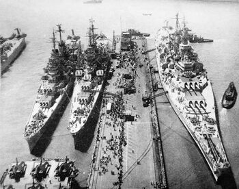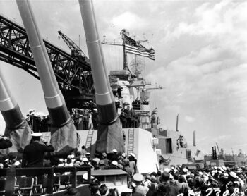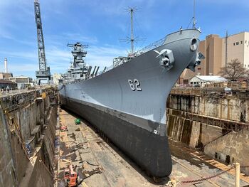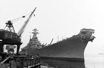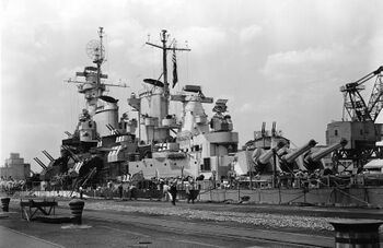 Линкор USS New Jersey в плавучем доке AFDB-1, 1952 г.Фото линкора USS New Jersey с Бруклинского моста. Нью-Йорк, 31 января 1948 г.Линкоры USS New Jersey и USS Missouri в Норфолке, 1954 г.