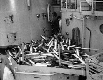 Члены экипажа USS Missouri загружают 406-мм снаряды, готовясь к бомбардировкам Кореи. Япония, февраль 1951 г. Используются специальные тележки для перемещения снарядов по верхней палубе линкора.Затвор 406-мм/50 орудия Mark 7 линкора USS Missouri, 1944 г.40-мм автоматы линкора USS Missouri ведут зенитный огонь, 1945 г.Центральный пост управления огнем 406-мм орудий линкора USS Missouri, 1951 г.406-мм ствол №393, стоявшем на USS Missouri с конца сентября 1945 до 25 мая 1953 г., совершив 180 выстрелов. Национальный заповедник дикой природы, Кейп-Чарльз, Вирджиния.Центральная часть линкора USS Missouri со 127-мм орудиями и 40-мм/20-мм автоматами, осень 1945 г.