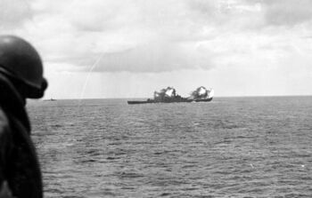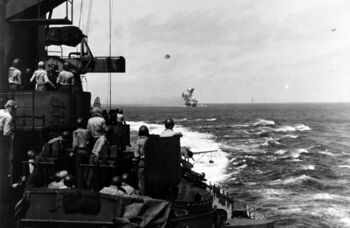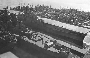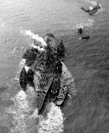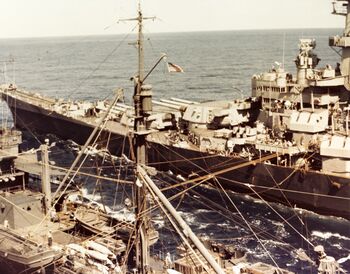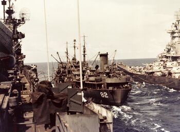 Линкор USS Iowa заправляется с USS Cahaba, 1945 г.Танкер USS Cahaba заправляет авианосец (слева) и линкор USS Iowa, 1945 г.